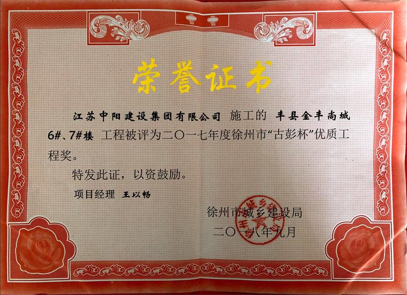 我公司榮獲2017年度徐州市“古彭杯”優(yōu)質(zhì)工程獎(jiǎng)
